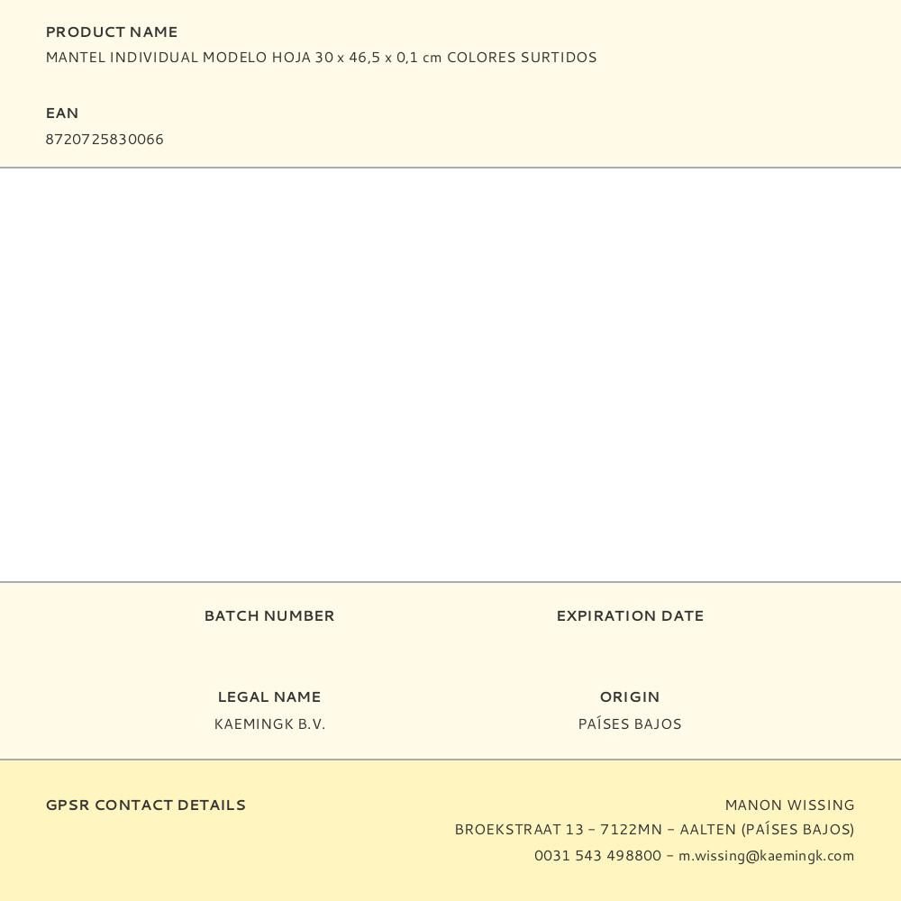 MANTEL INDIVIDUAL MODELO HOJA 30 x 46,5 x 0,1 cm COLORES SURTIDOS