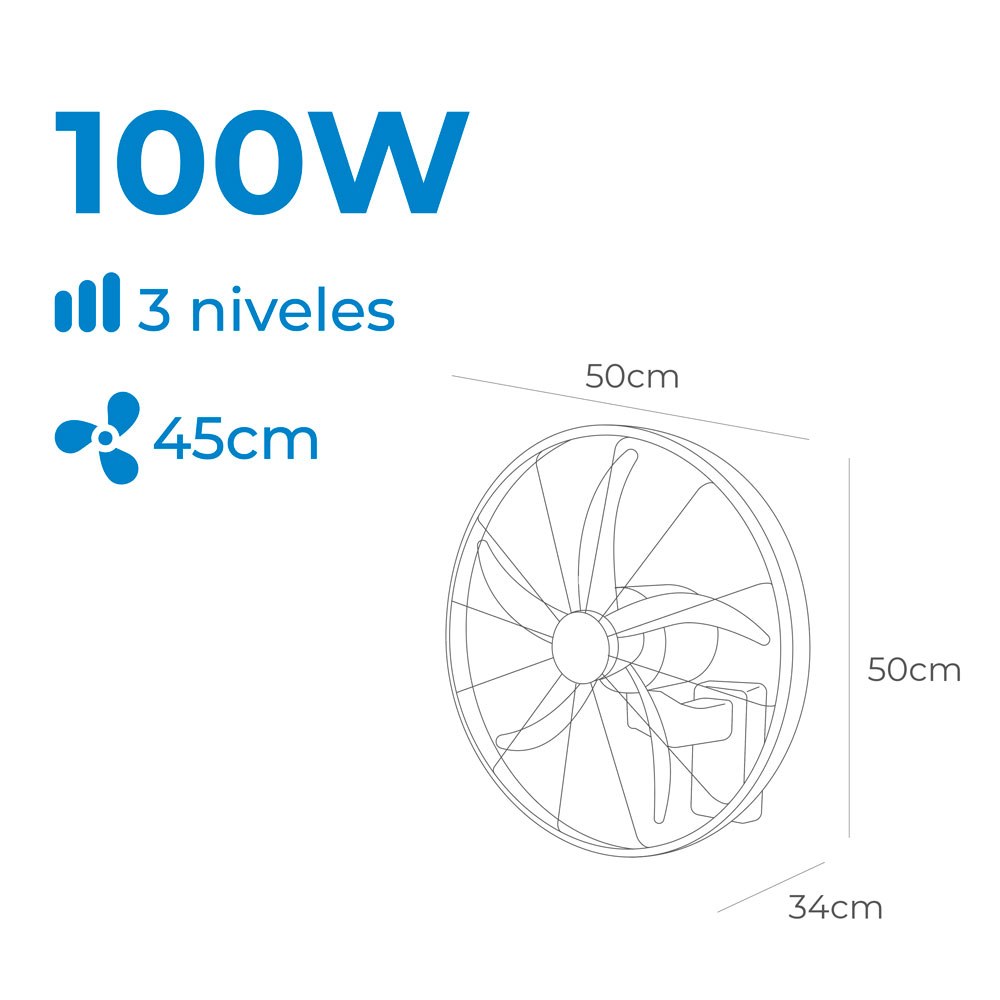 VENTILADOR PARED 100W 50cm CON MANDO . ASPAS DE Ø45 cm. 3 VELOCIDADES. INCLINABLE Y OSCILANTE. REJILLA DE SEGURIDAD. 4800m3/h. 64,7 dB. TEMPORIZADOR 7h. 220-240V