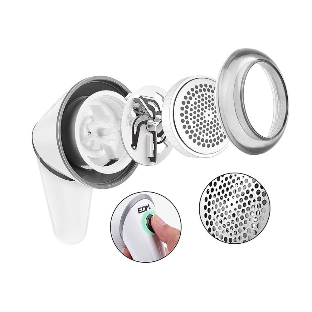 QUITA PELUSAS ELÉCTRICO RECARGABLE EDM. DOS BATERÍAS DE 400mAh. TIEMPO DE TRABAJO APROX: 45 MIN. TIEMPO DE CARGA: 8h MEDIANTE USB-C (CABLE INCLUIDO). INCLUYE CEPILLO DE LIMPIEZA. MANGO DE ROTACIÓN 90º.DIMENSIONES 8,5x9x13,5 cm