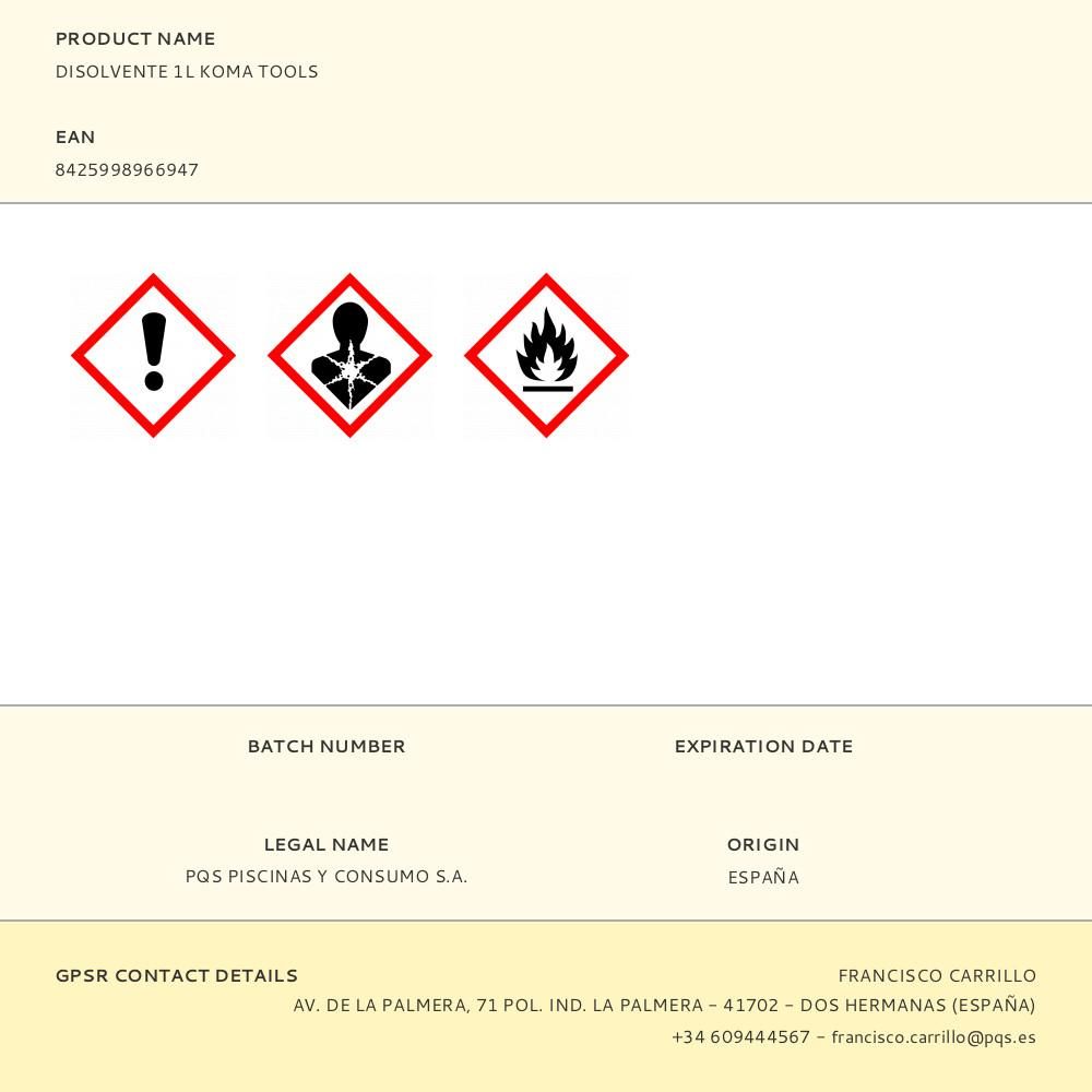 DISOLVENTE 1L KOMA TOOLS COMPUESTO FORMULADO PARA LA DILUCION DE PINTURAS Y LA LIMPIEZA DE UTENSILIOS COMO BROCHAS, PINCELES, PISTOLAS AEROGRAFICAS. DISOLVENTE TIPO SINTÉTICO
