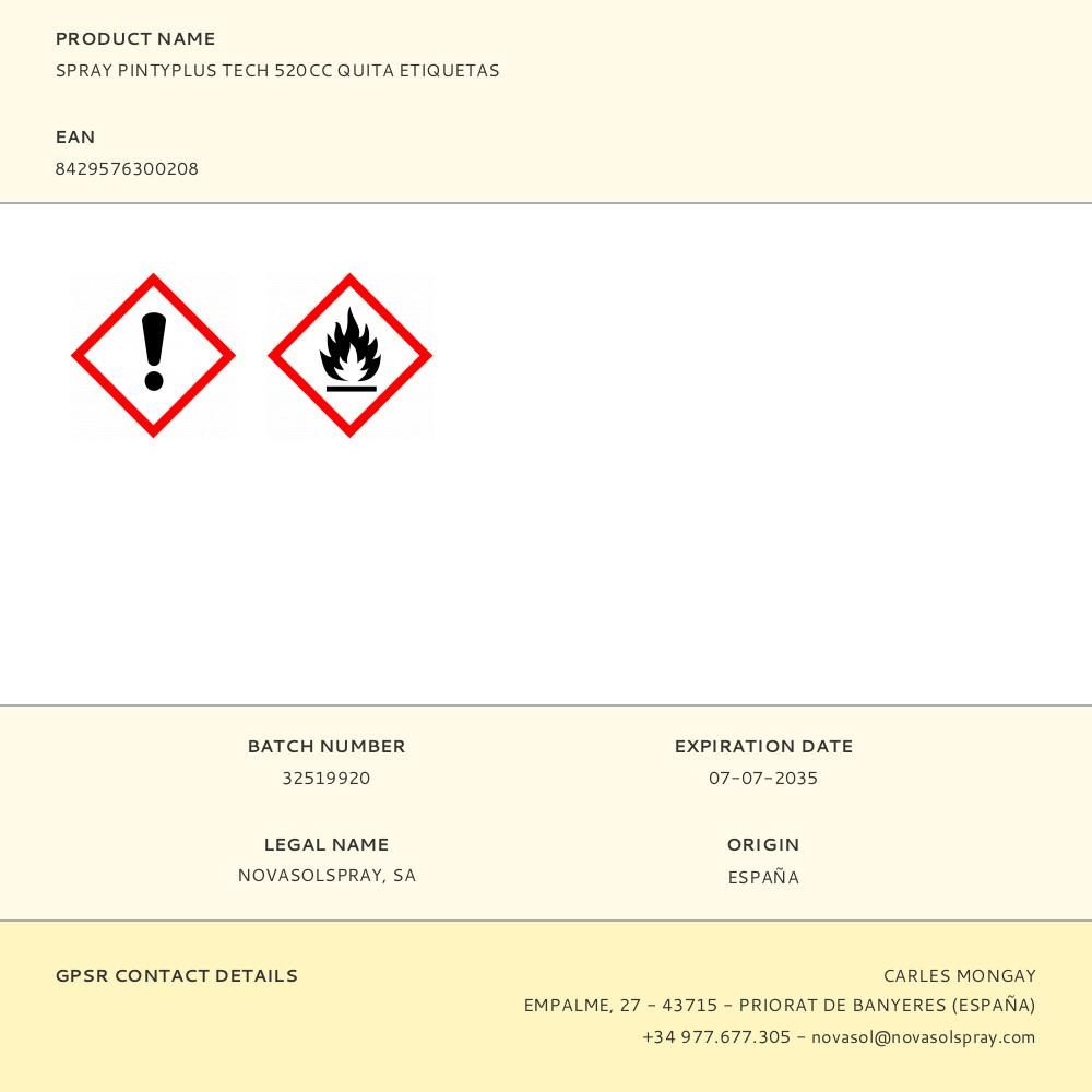 SPRAY TECH 520 cc REMOVEDOR DE ADHESIVOS ES EL ALIADO PERFECTO PARA ELIMINAR ETIQUETAS ADHESIVAS Y RESIDUOS DE ADHESIVOS DE FORMA SENCILLA Y EFECTIVA. APLICABLE EN VIDRIO, PLÁSTICO, METAL Y MADERA, ESTE PRODUCTO EN SPRAY SE APLICA DIRECTAMENTE SOBRE LA ETIQUETA O EL RESIDUO. SE TIENE QUE DEJAR ACTUAR DURANTE UNOS MINUTOS. DESPUÉS SE PROCEDE A ELIMINAR LA ETIQUETA Y ADHESIVO MEDIANTE UN SUAVE FROTE O RASPADO. OLVÍDATE DE LA MOLESTIA DE LAS ETIQUETAS PEGADAS EN TUS OBJETOS FAVORITOS O SUPERFICIES, Y DISFRUTA DE UNA LIMPIEZA SIN ESFUERZO