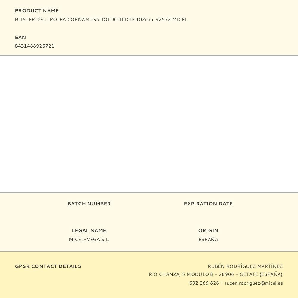 BLISTER DE 1 POLEA CORNAMUSA TOLDO TLD15 102mm 92572 MICEL