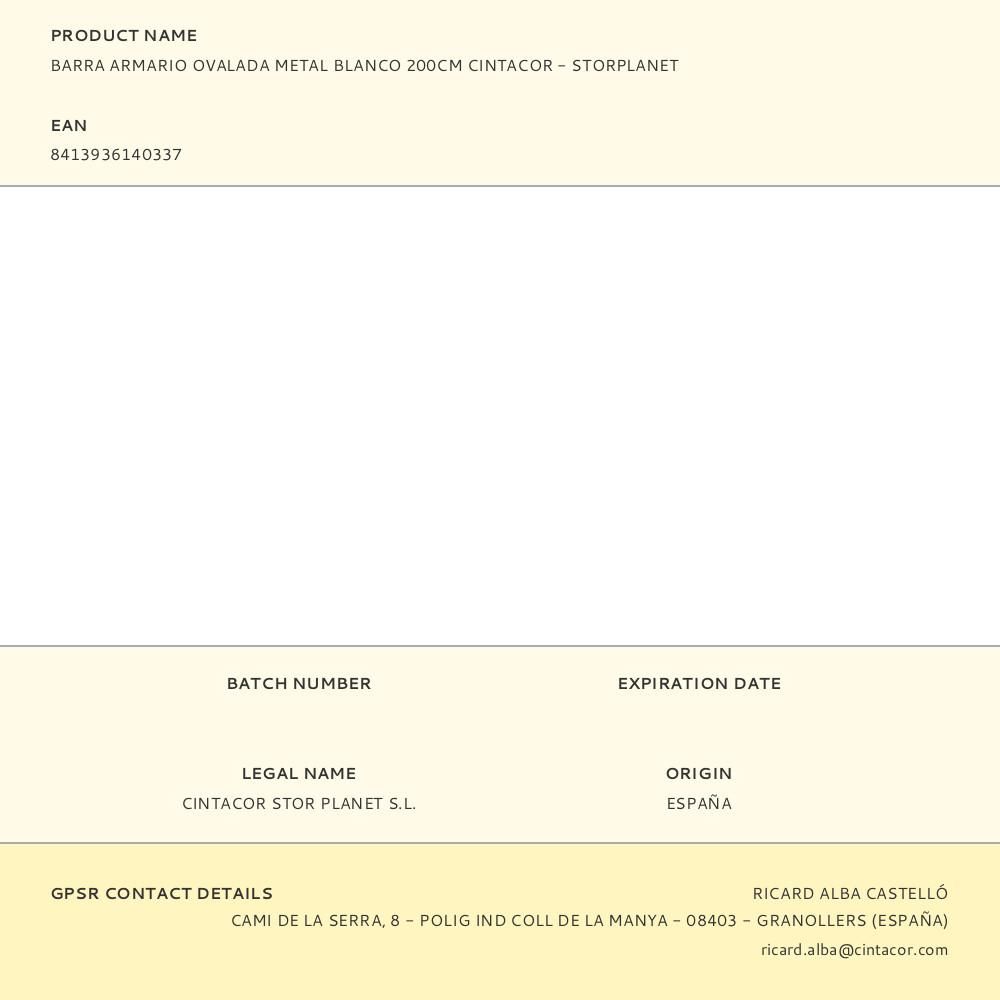 BARRA ARMARIO OVALADA METAL BLANCO 200CM CINTACOR - STORPLANET