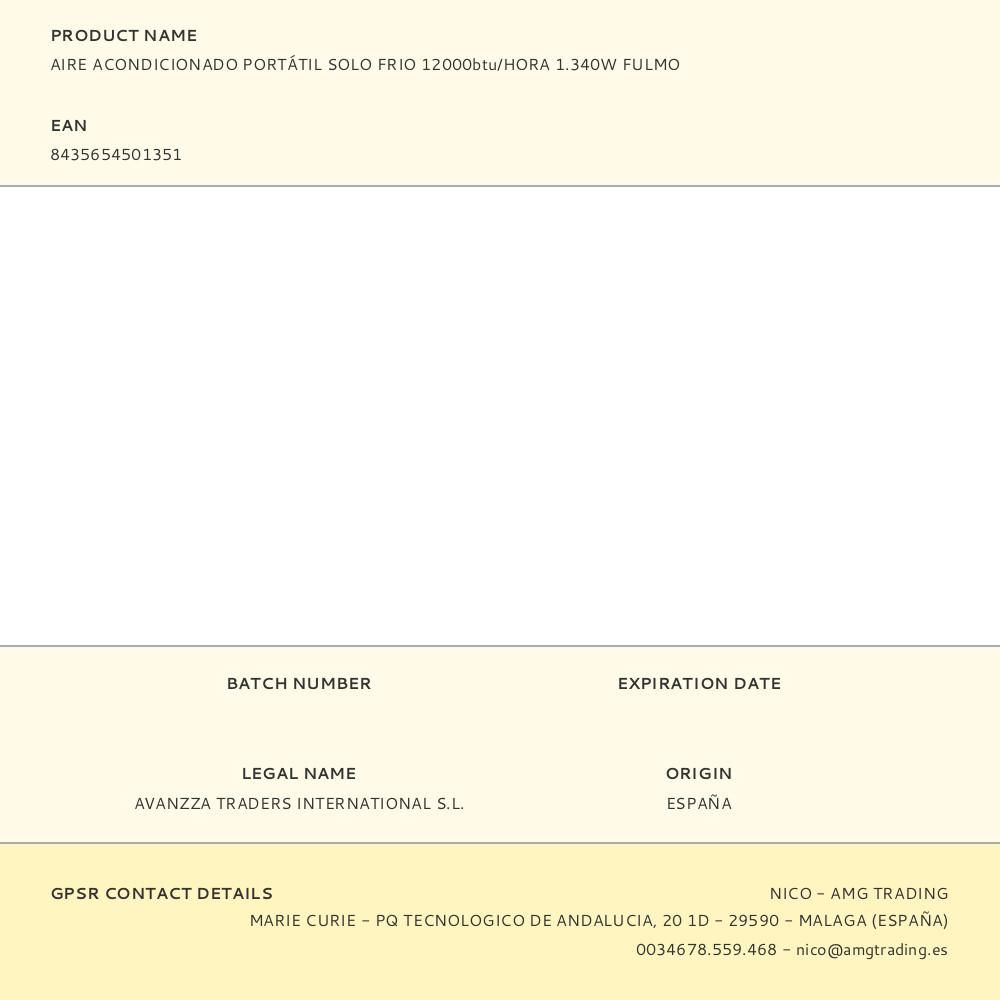 AIRE ACONDICIONADO PORTÁTIL SOLO FRIO 12000btu/HORA 1.340W FULMO. CLASIFICACIÓN REFRIGERACIÓN DE ENTRADA: 1.340W. CALENTAMIENTO DE ENTRADA NOMINAL 1.340W, PARA OPCIÓN CAPACIDAD DE ENFRIAMIENTO: 3500W. VOLUMEN DE AIRE 20-220m³/h. NIVEL DE RUIDO 64db, CONFIGURACION DEL TEMPORIZADOR DE 24 HORAS. INCLUYE FUNCIÓN VENTILADOR, DESHUMIDIFICADOR, MANDO A DISTANCIA. PESO 28.5kg. DIMENSIONES: 37x34,5x71,5cm.
