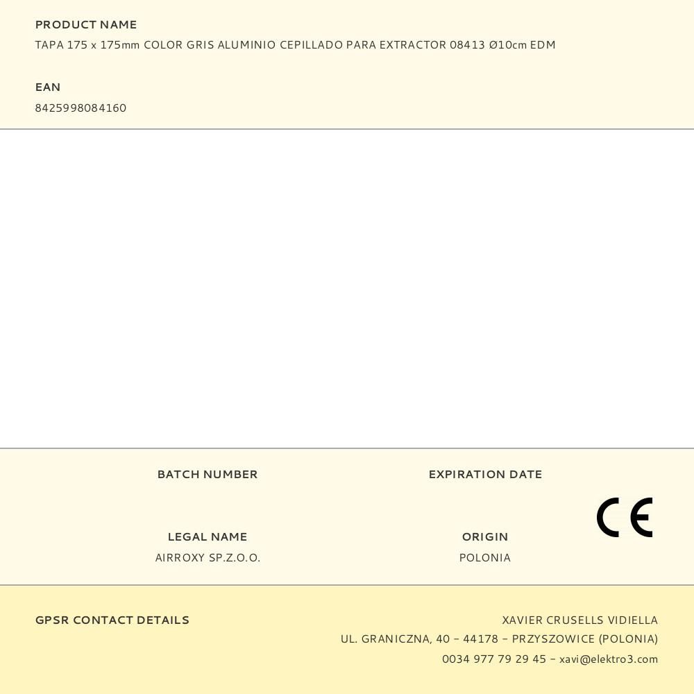 TAPA 175 x 175mm COLOR GRIS ALUMINIO CEPILLADO PARA EXTRACTOR 08413 Ø10cm EDM