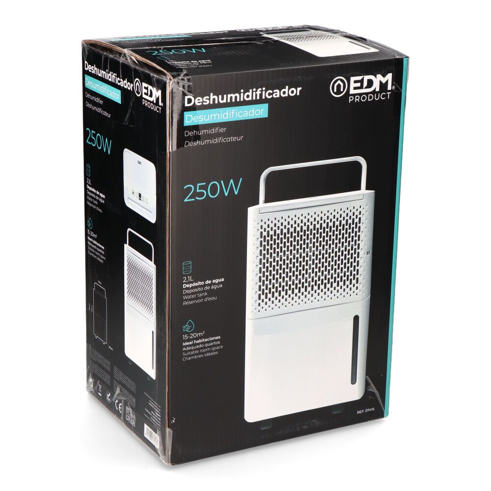 DESHUMIDIFICADOR BLANCO 250W,1,45 A, 12L DÍA A 30°C Y HUMEDAD RELATIVA DE 80% / 6L DÍA (27ºC - 60%). DEPÓSITO 2,1L. 42dB. VOLUMEN DE AIRE POR HORA: 100m³. ADECUADO PARA UN AREA DE 15- 20m². CARGA DE REFRIGERANTE R290/40g. PESO 9 kg. 27 x 20,5 x 50 cm. INCLUYE RUEDAS. EDM