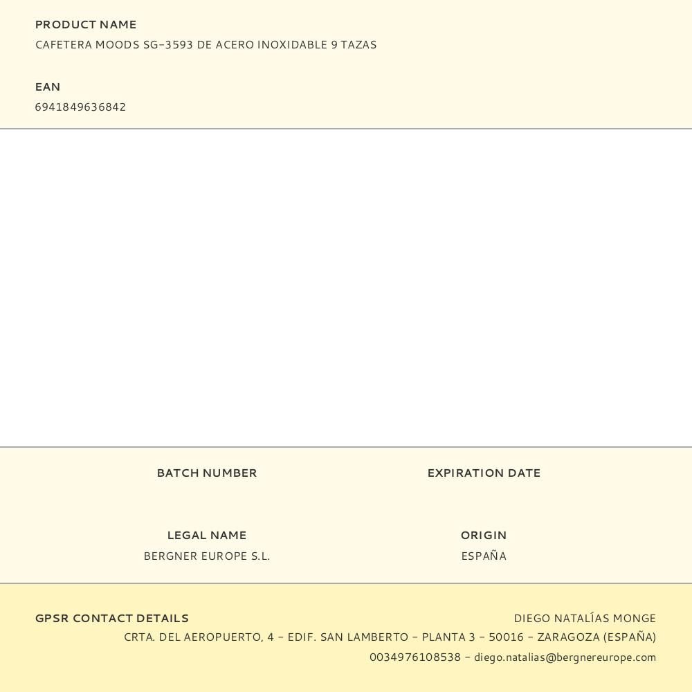 CAFETERA MOODS SG-3593 DE ACERO INOXIDABLE 9 TAZAS