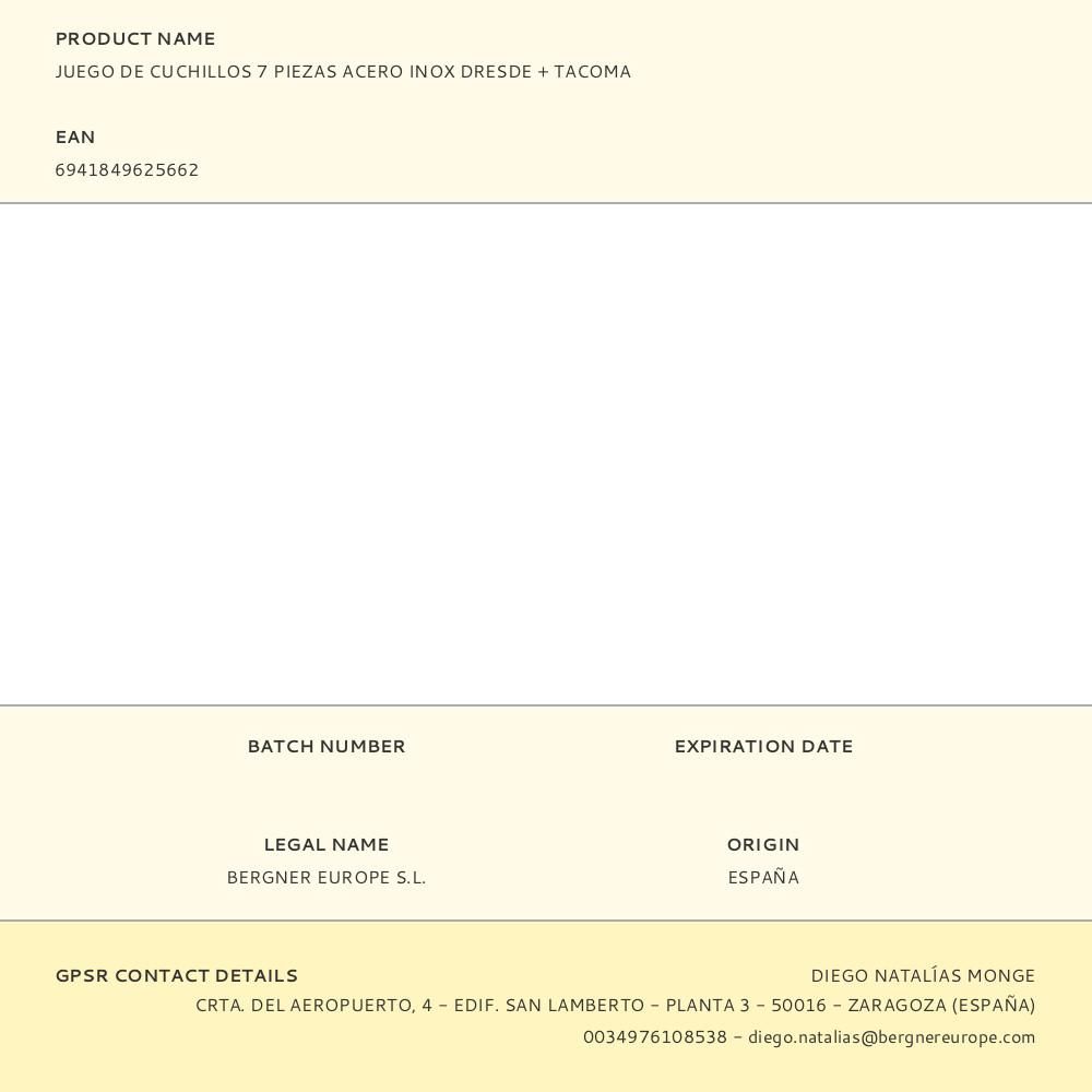 JUEGO DE CUCHILLOS 7 PIEZAS ACERO INOX DRESDE + TACOMA. CONTIENE: CUCHILLO DE CHEF 33,3 x 3,3 x 1,5 cm. CUCHILLO DE PAN 32,6 x 3,3 x 1,5 cm. CUCHILLO DE DESHUESAR 25,2 x 2,3 x 1,3 cm. CUCHILLO MULTIUSOS 23,6 x 2.3 x 1,3 cm. CUCHILLO DE PELAR 18,8 x 2,3 x 1,3 cm TIJERAS 21,4 cm x 7,77 x 1,2 cm. BLOQUE DE MADERA 6,1 x 10,5 x 20,7 cm