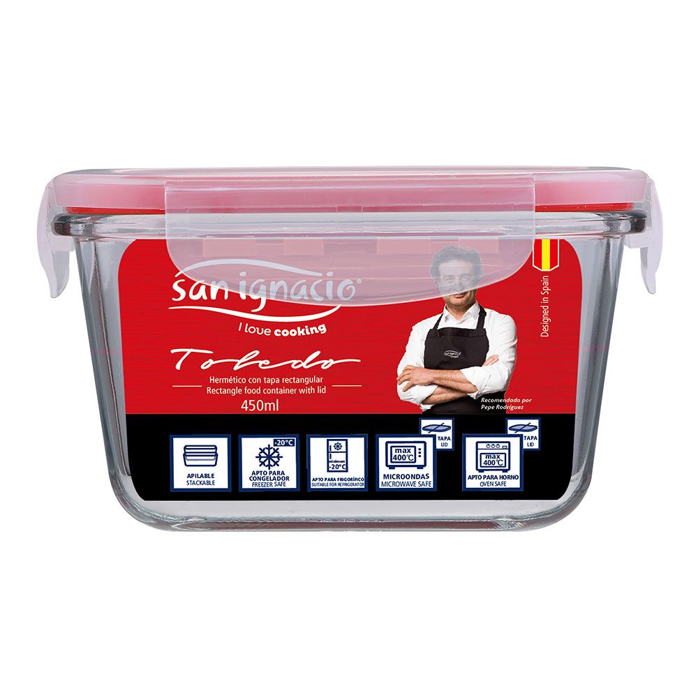 FIAMBRERA HERMÉTICA CRISTAL TOLEDO 450 ml. FABRICADO EN VIDRIO DE BOROSILICATO. TAPA DE PLÁSTICO PP CON LOS BORDES EN ROJO