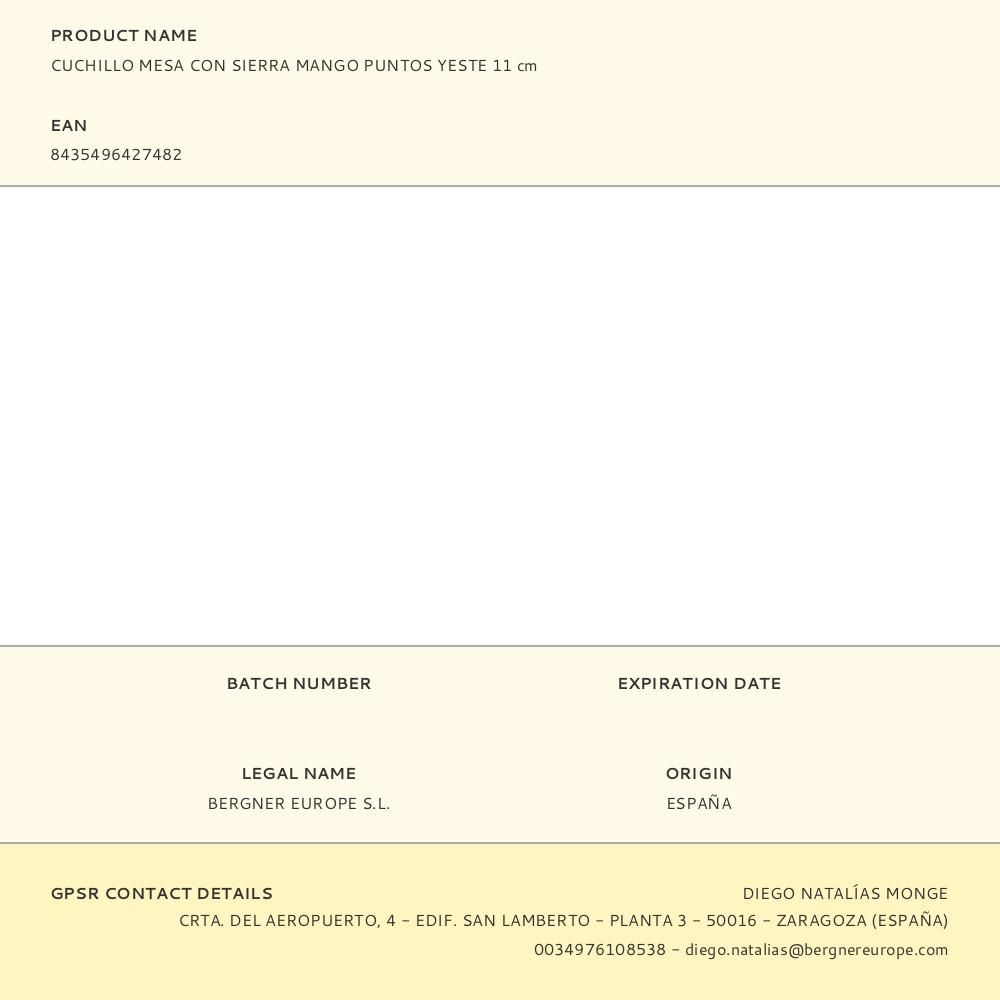 CUCHILLO YESTE CON SIERRA DE 11 cm FABRICADA EN ACERO INOXIDABLE Y CON MANGO DE PLÁSTICO CON PUNTOS
