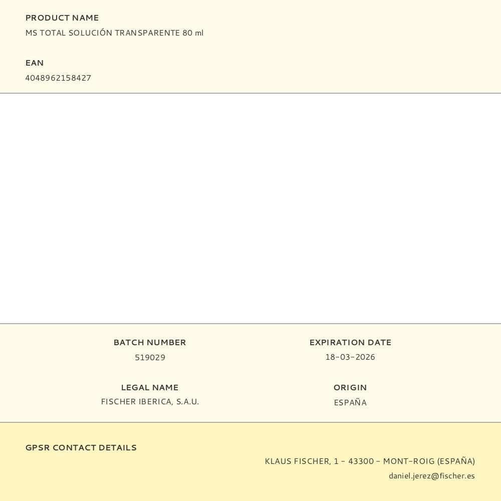 MS TOTAL SOLUCIÓN TRANSPARENTE 80ml 519029 FISCHER, ADHESIVO SELLADOR, TIENE UNA ELASTICIDAD DEL 700%, UNA FUERZA DE TRACCÓN DE 100 Kg/10cm², MULTIMATERIAL PARA TODO TIPO DE SUPERFICIES, SECA EN HÚMEDO, TANTO PARA EXTERIOR COMO PARA INTERIOR, A LA VEZ QUE PEGA ESTANQUEIZA.