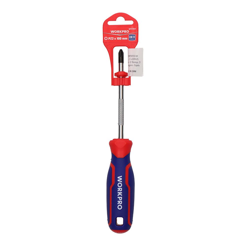 DESTORNILLADOR POZIDRIV PZ2 x 100 mm. CUERPO DE CROMO-VANADIO. PUNTA MAGNÉTICA NEGRA. MANGO TRICOLOR ERGONÓMICO DE AGARRE CÓMODO. AZUL Y ROJO