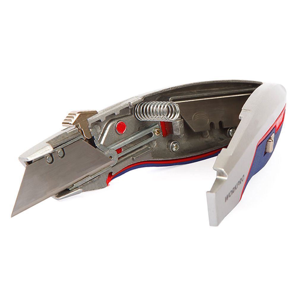 CÚTER DE APERTURA RÁPIDA. CUERPO DE ALUMINIO FUNDIDO CON AGARRE CÓMODO. 3 CUCHILLAS ADICIONALES ALMACENADAS EN EL MANGO. 165 x 41 x 28 mm