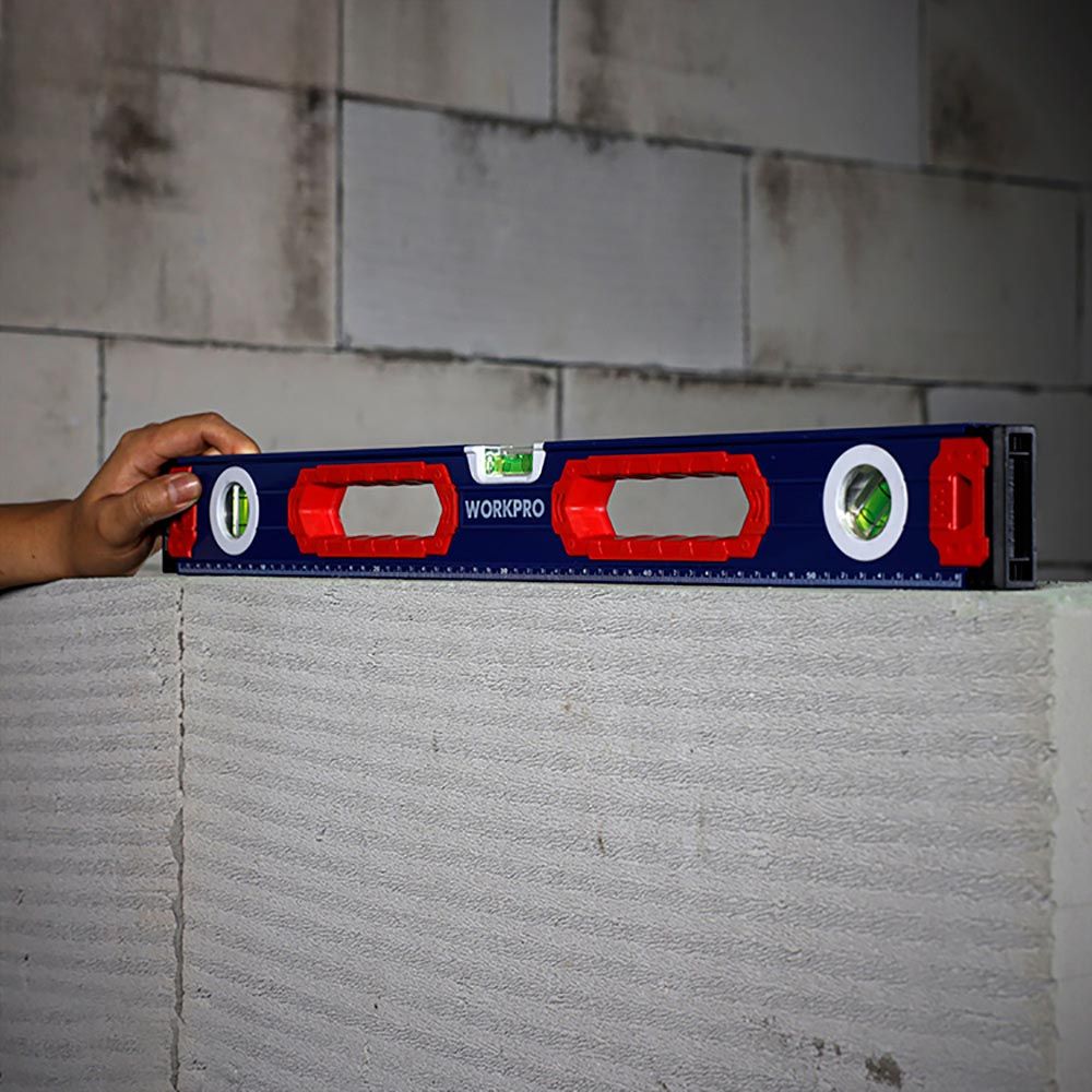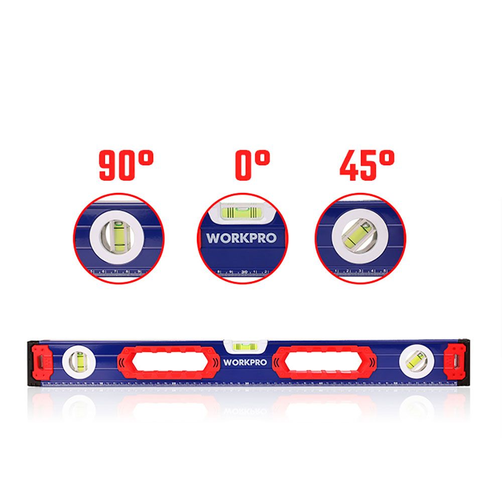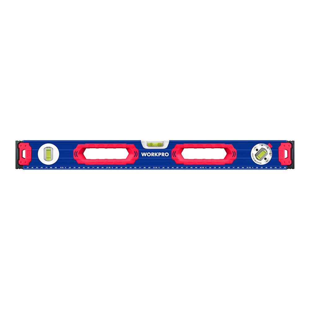 NIVEL DE BURBUJA CON BASE MAGNÉTICA 60 cm. CONTERA A PRUEBA DE GOLPES. MARCO DE ALEACIÓN DE ALUMINIO. ANILLO DE AGARRE GRANDE, CÓMODO DE USAR. PRECISIÓN 1 mm/1 m, 3 VIALES. (45°/90°/180°). CON ESCALAS, MÁS FÁCIL DE LEER. BASE MAGNÉTICA. AZUL Y ROJO. 600 x 65 x 25 mm