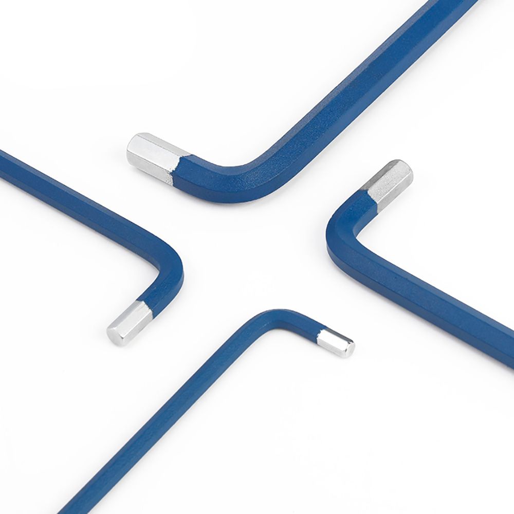 JUEGO DE 9 LLAVES HEXAGONALES DE BRAZO LARGO, MÉTRICO. ACERO AL CROMO-VANADIO, TEMPLADO. 9 LLAVES HEXAGONALES CON PUNTA DE BOLA MÉTRICA: 1,5, 2, 2,5, 3, 4, 5, 6, 8 Y 10 mm. AZUL