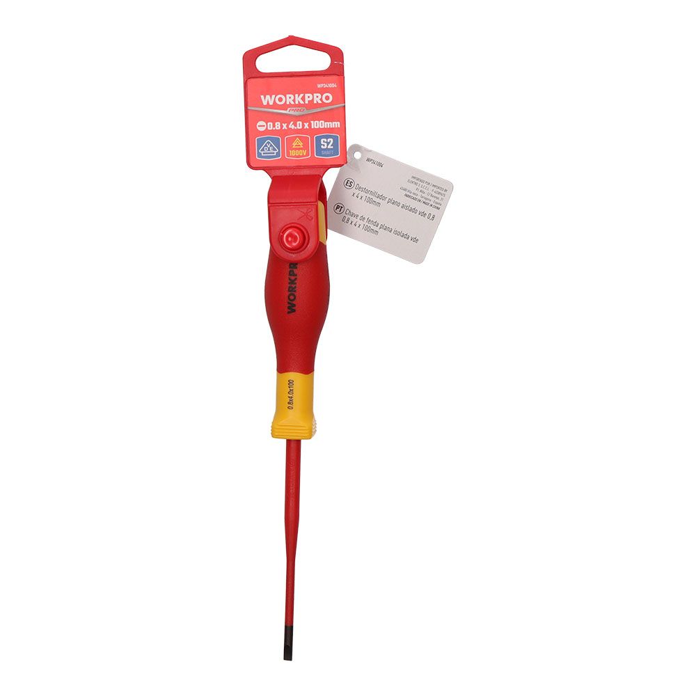 DESTORNILLADOR PLANO AISLADO VDE 0,8 x 4 x 100 mm. APROBADO PARA 1. 000 V AC - FABRICADO SEGÚN EN/IEC 60900, CADA HERRAMIENTA SE PRUEBA INDIVIDUALMENTE A 10 000 V CA - EL DISEÑO ERGONÓMICO DE LOS COMPONENTES DEL MANGO PERMITE UN TRABAJO PRECISO Y SIN FATIGA. LA HOJA DELGADA CON AISLAMIENTO COMPLETO GARANTIZA UN FÁCIL ACCESO A LOS TORNILLOS PROFUNDOS. CUERPO DE ACERO S2 AL CROMO VANADIO MOLIBDENO, COLOR ROJO Y AMARILLO
