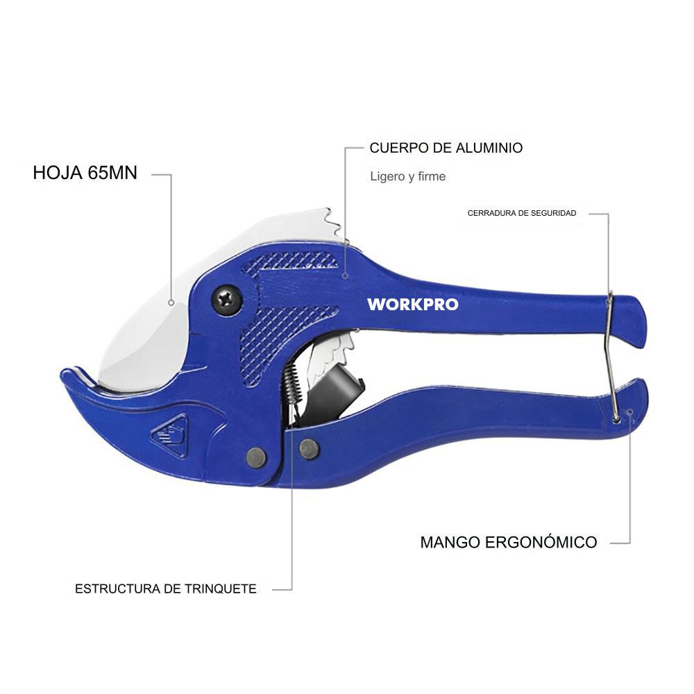 TIJERA CORTATUBOS DE LIBERACIÓN RÁPIDA DE 42mm. CUENTA CON ACCIÓN DE TRINQUETE PARA UN CORTE RÁPIDO Y FÁCIL. HOJA DE ACERO TRATADA TÉRMICAMENTE, REEMPLAZABLE. CONSTRUCCIÓN DE ALEACIÓN DE ALUMINIO. CAPACIDAD DE CORTE: DIÁMETRO EXTERIOR 42 mm