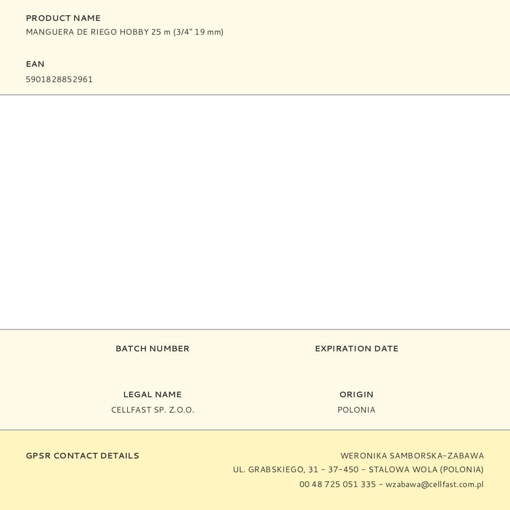 MANGUERA DE RIEGO HOBBY Ø19 mm, ¾ pulg, 25 m. 6 CAPAS EN PVC + REFUERZO TEXTIL TRICOTADO ELICOIDAL Y SISTEMA ANTI TORSIÓN AVANZADO. HASTA 32 bar DE PRESIÓN, AGUNTA TEMPERATURAS QUE VAN DE LOS -20 °C HASTA LOS 60 °C. RESISTENTE A LOS RAYOS UV DEL SOL, MUY FLEXIBLE Y PROVISTA DE SISTEMA ANTITORSIÓN DE SEGUNDA GENERACIÓN. SISTEMA ANTIALGAS Y CUMPLE CON LA NORMATIVA EUROPEA REACH (LIBRE DE FTALATOS)