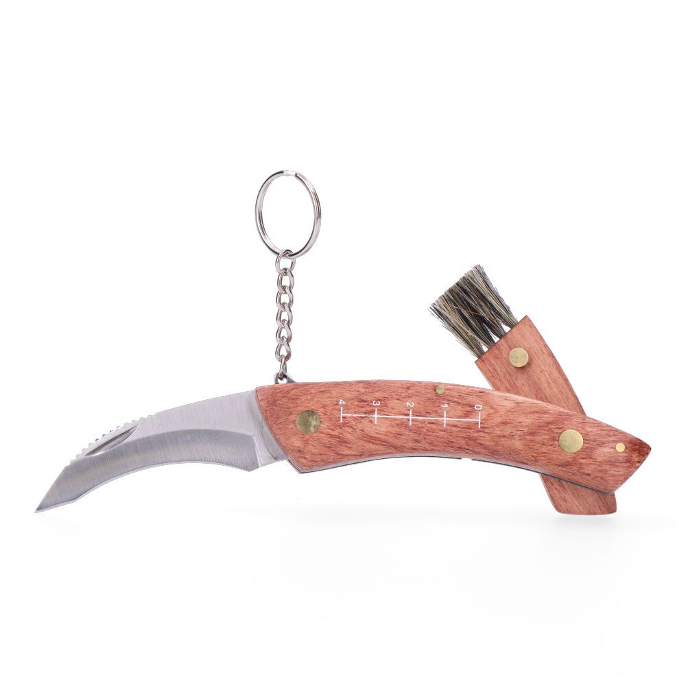 NAVAJA RECOGE SETAS CON MANGO DE MADERA, HOJA DE ACERO INOXIDABLE 420, INCLUYE ESTUCHE DE NYLON Y ENGANCHE PARA CINTURÓN, CONSTA DE 4 FUNCIONES: CUCHILLO, LLAVERO, CEPILLO PLEGABLE Y MEDIDOR, SERIE IRATI