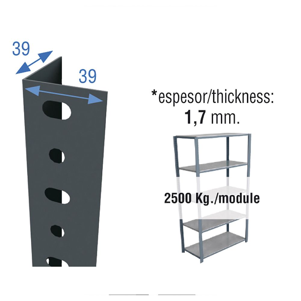 PERFIL METÁLICO 39x39mm PARA ESTANTER¡A CLÁSICA CON TORNILLOS. ESPESOR: 1,7mm. CAPACIDAD DE CARGA: 2500Kg/módulo (4 PERFILES). PINTURA EPOXI-POLIÉSTER RAL 7046 GRIS OSCURO. SIMON RACK