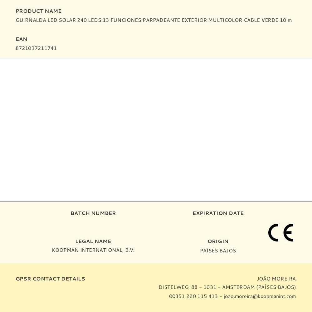 GUIRNALDA SOLAR CON 240 LED MULTICOLOR, PARA USO EXTERIOR IP44. 13 FUNCIONES PARPADEANTES. CABLE ALIMENTACIÓN VERDE DE 3 m. CABLE DE ALIMENTACIÓN USB AL PANEL SOLAR COLOR NEGRO, CON MANDO A DISTANCIA QUE FUNCIONA CON 1 PILA CR2025 INCLUIDA. DISTANCIA ENTRE PRIMER Y ULTIMO LED 10m, LARGO TOTAL 13m. TEMPORIZADOR DE 6h