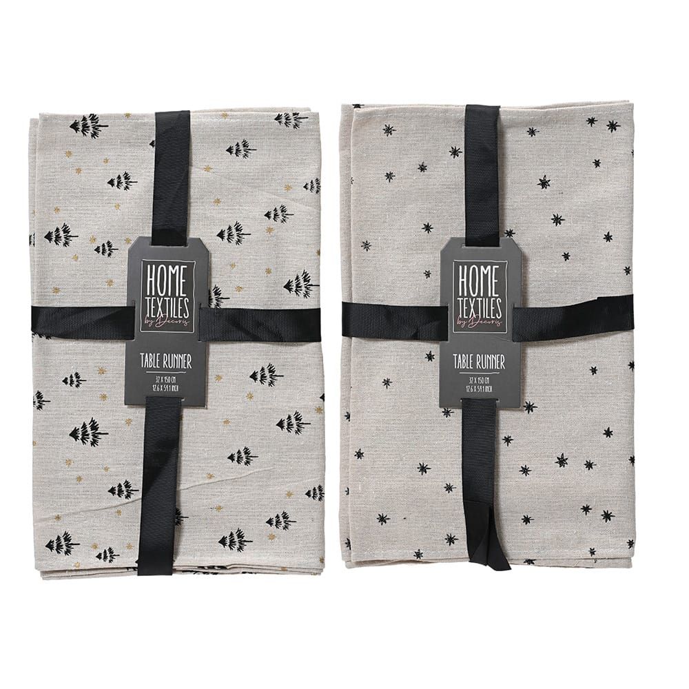 CAMINO DE MESA CON ESTAMPADOS EN NEGRO, 2 MODELOS: 1 x PINOS Y ESTRELLAS DORADAS, 1 x ESTRELLAS NEGRAS, 32 x 150 cm