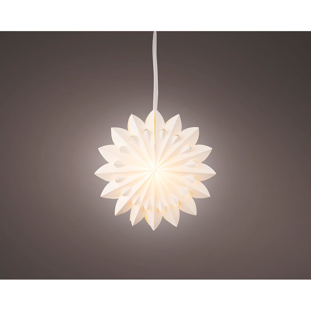 ESTRELLA COLGANTE DE PAPEL CON 6 LED, LUZ FIJA BLANCA CÁLIDA, PARA INTERIOR, MEDIDA: Ø40 x 20,5 cm, FUNCIONA CON PILAS 3 x AA (NO INCLUIDAS), CABLE DE ALIMENTACIÓN 50 cm COLOR TRANSPARENTE, TEMPORIZADOR 6h ENCENDIDO / 16H APAGADO