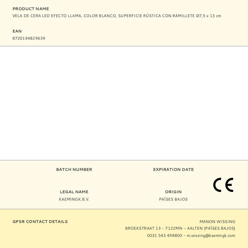 VELA DE CERA LED EFECTO LLAMA, COLOR BLANCO, SUPERFICIE RÚSTICA CON RAMILLETE. MEDIDAS: Ø7,5 x 13 cm. USO: INTERIOR. COLOR LED: LUZ CÁLIDA. CON TEMPORIZADOR 6 h ENCENDIDA/18 h APAGADA, AUTONOMÍA: 280 h, FUNCIONA CON PILAS 2 x AA (NO INCLUIDAS)