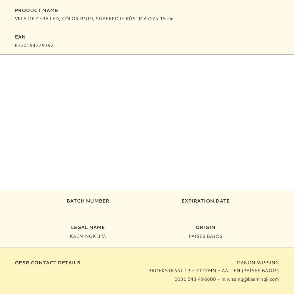 VELA DE CERA LED, EFECTO LLAMA, COLOR ROJO, SUPERFICIE RÚSTICA, MEDIDAS: Ø7 x 15 cm. USO: INTERIOR. COLOR LED: LUZ CÁLIDA - CON TEMPORIZADOR 6 h ENCENDIDA/18 h APAGADA - AUTONOMÍA: 250 h - FUNCIONA CON PILAS 2 x AAA (NO INCLUIDAS)