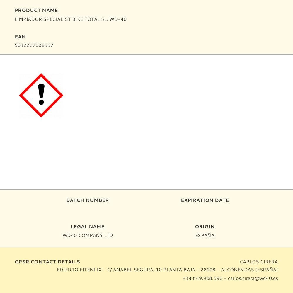 LIMPIADOR SPECIALIST BIKE TOTAL 5L TANTO SI ERES AFICIONADO A LA BICI DE CARRETERA O LO TUYO SON LAS PISTAS FORESTALES, DESCUBRIRÁS QUE EL LIMPIADOR TOTAL WD-40 SPECIALIST® BIKE ES UN ALIADO ESENCIAL A LA HORA DE LIMPIAR TU BICICLETA SIN DAÑARLA. LA MAYORÍA DE LOS LIMPIADORES SON MUY AGRESIVOS CON LAS SUPERFICIES POR LO QUE ACABAN DETERIORÁNDOLAS CON EL USO PROLONGADO. POR ESA RAZÓN HEMOS DESARROLLADO UNA REVOLUCIONARIA FÓRMULA QUE ES ALTAMENTE COMPATIBLE CON TODOS LOS MATERIALES, AL MISMO TIEMPO QUE OFRECE UN ÓPTIMO NIVEL DE LIMPIEZA DE ESTOS SIN DAÑARLOS. POLIVALENTE, FÁCIL DE USAR Y COMPATIBLE CON LA MAYORÍA DE LOS MATERIALES. LIMPIEZA INTEGRAL DE LA BICI. A BASE DE AGUA Y SIN DISOLVENTES, LIMPIA LA SUCIEDAD Y LA MUGRE, SPRAY AMPLIO O PRECISO, FÓRMULA DE LIMPIEZA RÁPIDA, COMPATIBLE C...