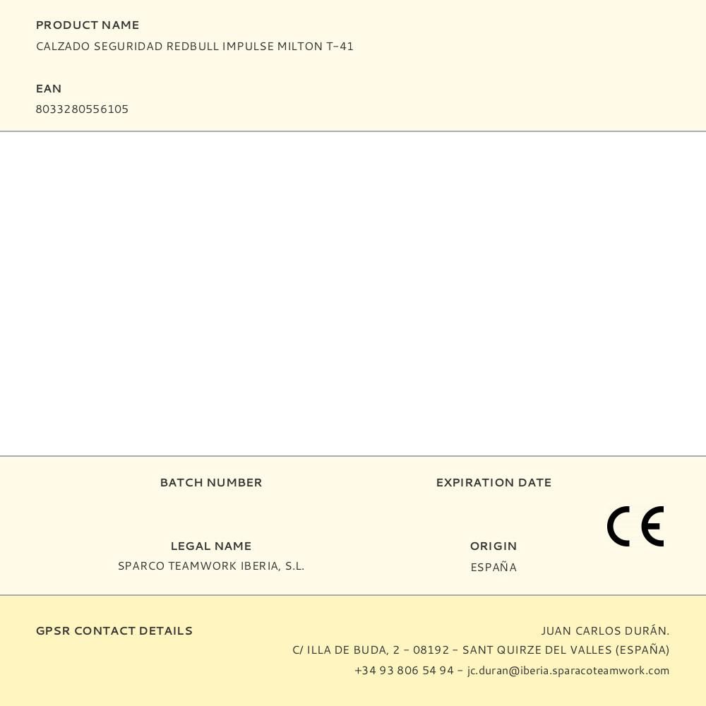 CALZADO DEPORTIVO DE SEGURIDAD REDBULL, LA LÍNEA IMPULSE MILTON ESD S1PS, TALLA 41 CON TODAS LAS TECNOLOGÍAS DE PROTECCIÓN. SUELA EN EVA SUPER-CONFORT+SUELA INFERIOR GOMA NITRÍLICA FO+HRO. TEJIDO 3D SEAMLESS DE ALTA TRANSPIRABILIDAD, REF TPU ANTI ABRASIÓN Y DETALLES 3D EN HF. PLANTILLA PERFORAZIONE -ZERO.