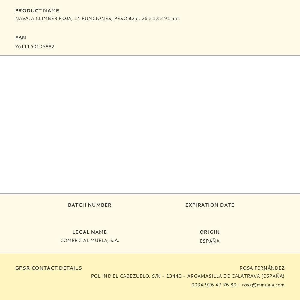 NAVAJA CLIMBER ROJA, 14 FUNCIONES, PESO 82 g, 26 x 18 x 91 mm