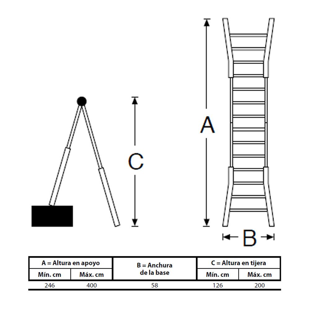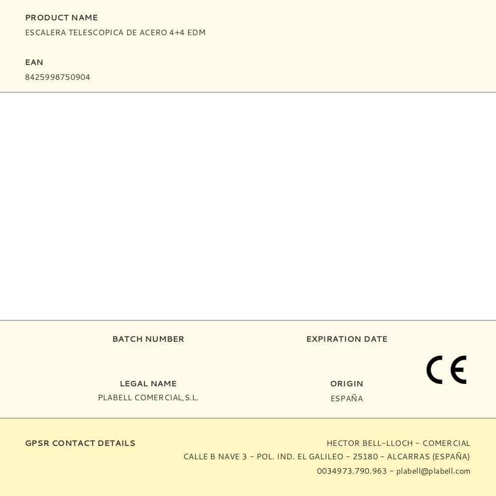 ESCALERA TELESCOPICA DE ACERO, PELDAÑOS EXTERIORES 4, INTERIORES 4. SISTEMA DE POSICIONAMIENTO DE FUNDICIÓN DE ALUMINIO Y BISAGRAS DE ACERO CON SISTEMA DE BLOQUEO. POSIBILIDAD DE APOYO EN LA PARED MÍN 2,46 - 4 m x 58 cm, FORMATO TIJERA MÍN 1,26 - 2 m x 58 cm. O FORMATO EN MULTIPOSICIÓN, PESO 12KG, NORMA ACAL 100. EDM