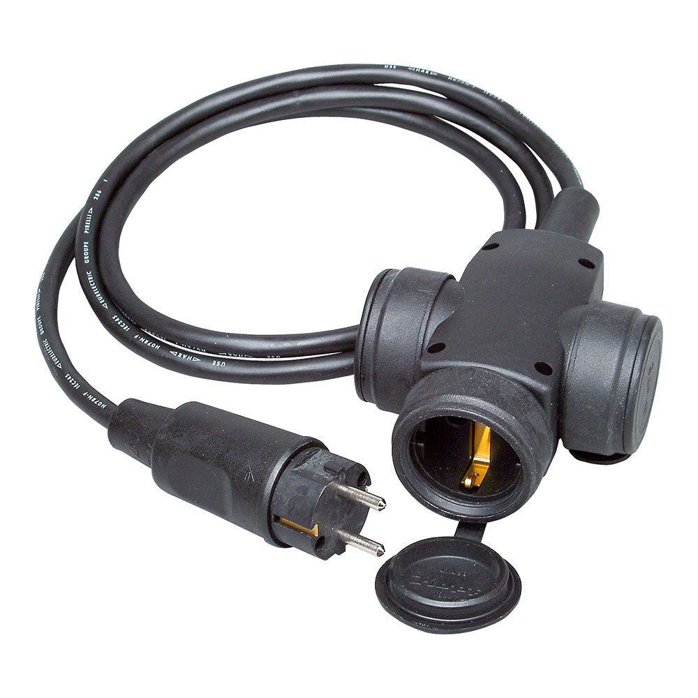 ALARGADERA H07RN-F 3x1,5mm², 1,5M DE LONGITUD CON CLAVIJA Y BASE AEREA TRIPLE GOMA CON TAPA, 230V 16A, IP44, CEE7/4 (TIPO F), NEGRA. KOPP