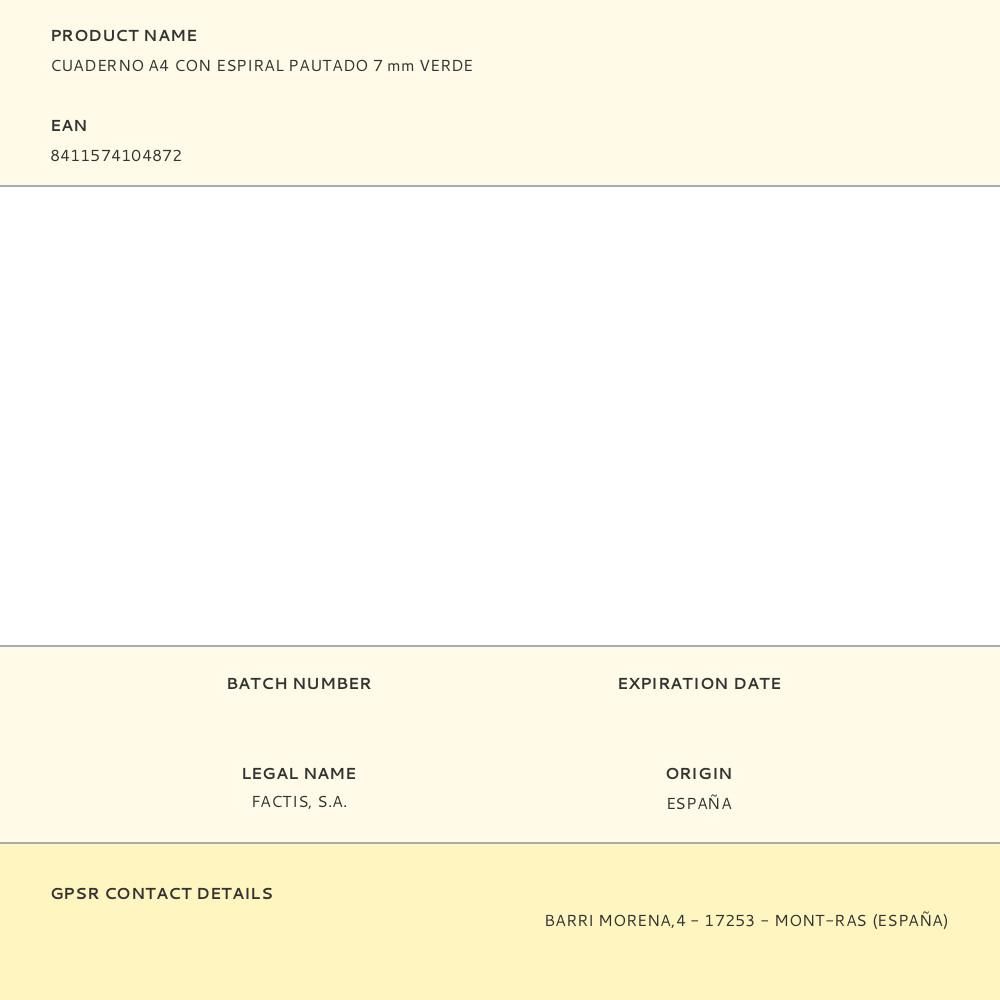 CUADERNO A4 CON ESPIRAL METÁLICA Y TAPA DURA, COLOR VERDE. 80 HOJAS DE PAPEL PAUTADO A LÍNEAS (LÍNEA SIMPLE DE 7mm). PAPEL DE 95 GR/M² DE ALTA CALIDAD, MICROPERFORADO Y CON 4 TALADROS. INICIADOR DE CORTE PARA FACILITAR LA SEPARACIÓN DE CADA HOJA. ESPIRAL FLEXIBLE CON CIERRE DE SEGURIDAD. COLECCIÓN 430 SINCE 1918, FABRICADAS EN ESPAÑA DESDE 1918.