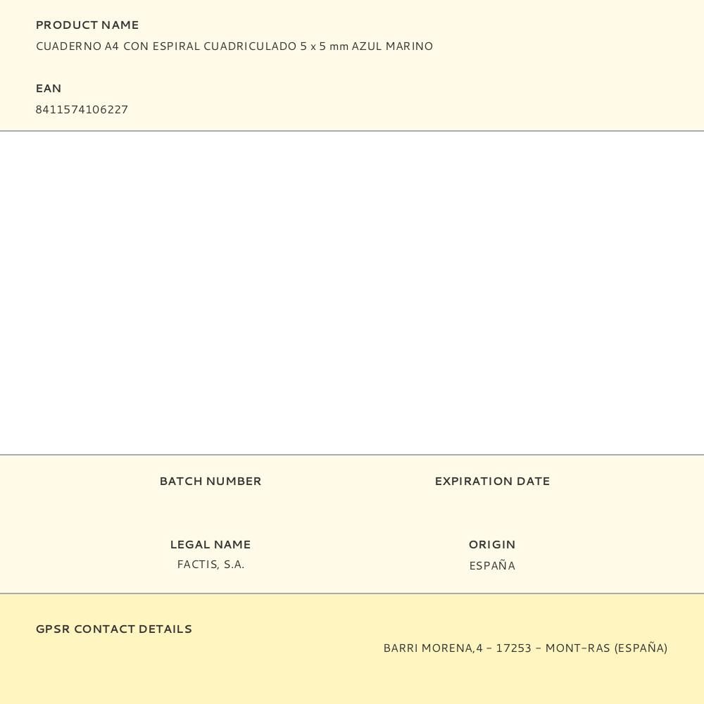 CUADERNO A4 CON ESPIRAL METÁLICA Y TAPA DURA, COLOR AZUL MARINO. 80 HOJAS DE PAPEL CUADRICULADO (5x5mm). PAPEL DE 95 GR/M² DE ALTA CALIDAD, MICROPERFORADO Y CON 4 TALADROS. INICIADOR DE CORTE PARA FACILITAR LA SEPARACIÓN DE CADA HOJA. ESPIRAL FLEXIBLE CON CIERRE DE SEGURIDAD. COLECCIÓN 430 SINCE 1918, FABRICADAS EN ESPAÑA DESDE 1918.