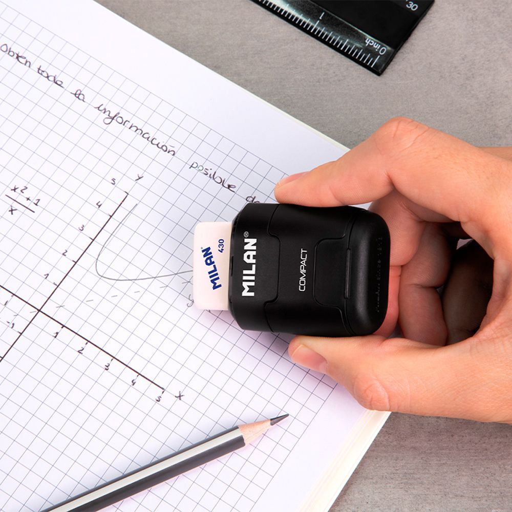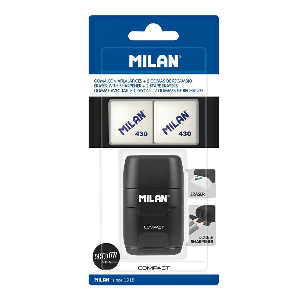 COMBINACIÓN DE GOMA DE BORRAR Y SACAPUNTAS DOBLE (ESTÁNDAR Y MAXI) CON DEPÓSITO. DISEÑO COMPACT SERIE ESPECIAL SHADOW, COLOR NEGRO. GOMA CUADRADA DE CAUCHO SINTÉTICO TIPO 'MIGA DE PAN'. EL SACAPUNTAS DISPONE DE UNA CUCHILLA DE ACERO AFILADA Y RESISTENTE, IDEAL PARA TODO TIPO DE LÁPICES. SACAPUNTAS CON CUCHILLA DE SEGURIDAD: ESTE SISTEMA EVITA QUE SE PUEDA SEPARAR LA HOJA DEL CUERPO DEL SACAPUNTAS. DISEÑO ORIGINAL CREADO POR EL DEPARTAMENTO DE I+D DE MILAN. INCLUYE 2 GOMAS DE BORRAR DE RECAMBIO (MODELO 430). LAS GOMAS DE BORRAR MILAN ESTÁN FABRICADAS EN ESPAÑA DESDE 1918.