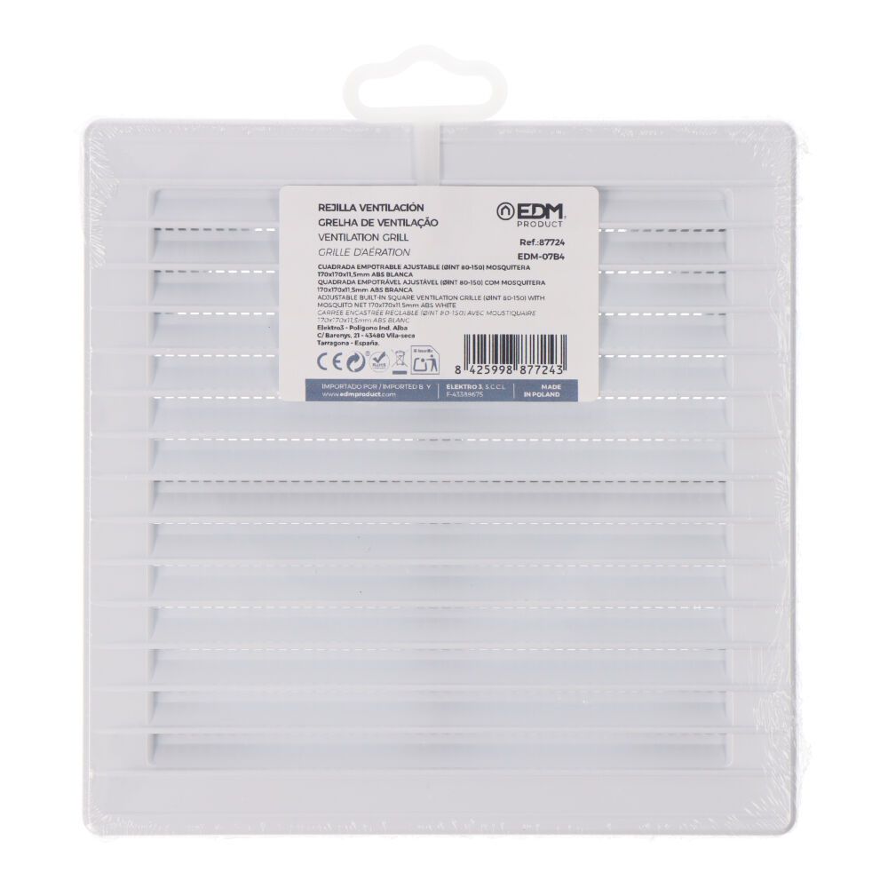 REJILLA VENTILACIÓN CUADRADA EMPOTRABLE AJUSTABLE Ø 80-150 CON MOSQUITERA 170x170x11,5mm ABS BLANCA
