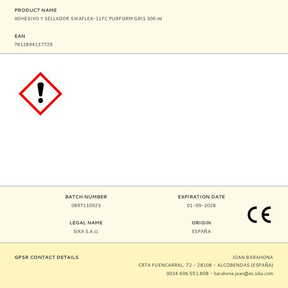 MASILLA MONOCOMPONENTE A BASE DE POLIURETANO SIKAFLEX-11FC PURFORM, COLOR GRIS - DE ELASTICIDAD PERMANENTE, CURADO POR HUMEDAD. SE UTILIZA COMO SELLADOR DE JUNTAS TANTO VERTICALES COMO COMO HORIZONTALES, COMO AMORTIGUADOR ACÚSTICO ENTRE HORMIGÓN Y PERFORACIONES DE TUBERÍAS Y COMO ADHESIVO MULTIUSOS. ADECUADO PARA APLICACIONES TANTO EN INTERIOR COMO EN EXTERIOR. CARTUCHO DE 300 ml