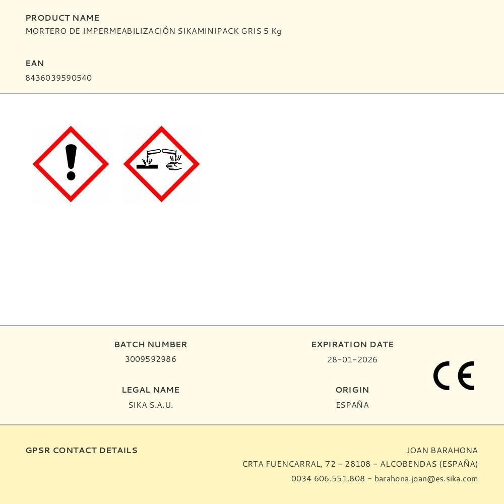 SIKAMINIPACK, MORTERO IMPERMEABILIZANTE, MONOCOMPONENTE, GRIS PARA REVESTIMIENTOS DE CAPA DELGADA. ESPECIALMENTE DESARROLLADO PARA LA IMPERMEABILIZACIÓN Y PROTECCIÓN DE CIMENTACIONES, SÓTANOS, FOSOS DE ASCENSOR Y MUROS PARCIALMENTE ENTERRADOS.PUEDE SER APLICADO SOBRE HORMIGÓN, MAMPOSTERÍA Y ENFOSCADOS. BOLSA DE 5 Kg UNA VEZ ABIERTO CONSUMIR ANTES DE 12 MESES