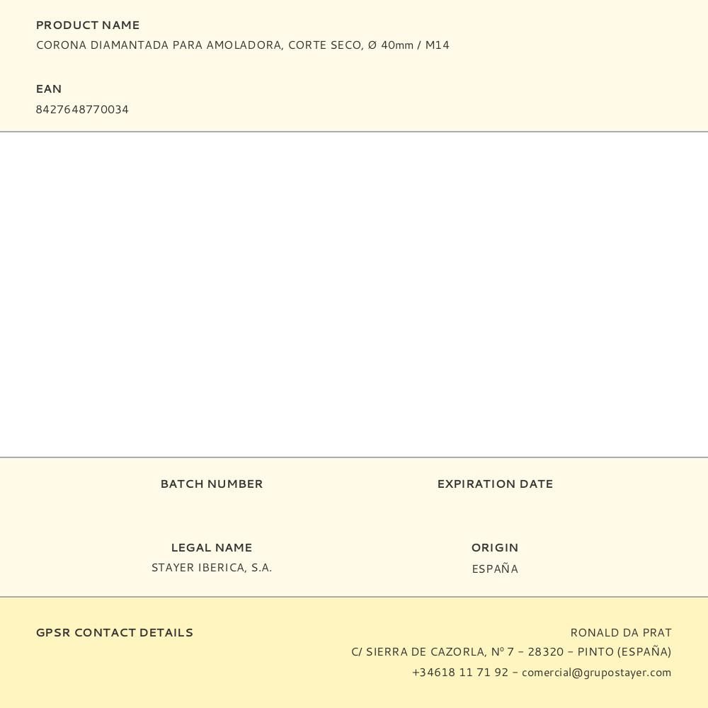 CORONA DIAMANTADA Ø40 mm, DE CORTE SECO CON INSERCIÓN M14 PARA USO CON AMOLADORAS. ESPECIALMENTE DISEÑADAS PARA PERFORACIÓN DE GRES, MATERIALES PORCELÁNICOS Y CERÁMICA, TAMBIÉN PRESENTAN UN EXCELENTE RENDIMIENTO EN LA PERFORACIÓN DE PIEDRAS NATURALES DE ALTA DUREZA COMO EL MÁRMOL O EL GRANITO