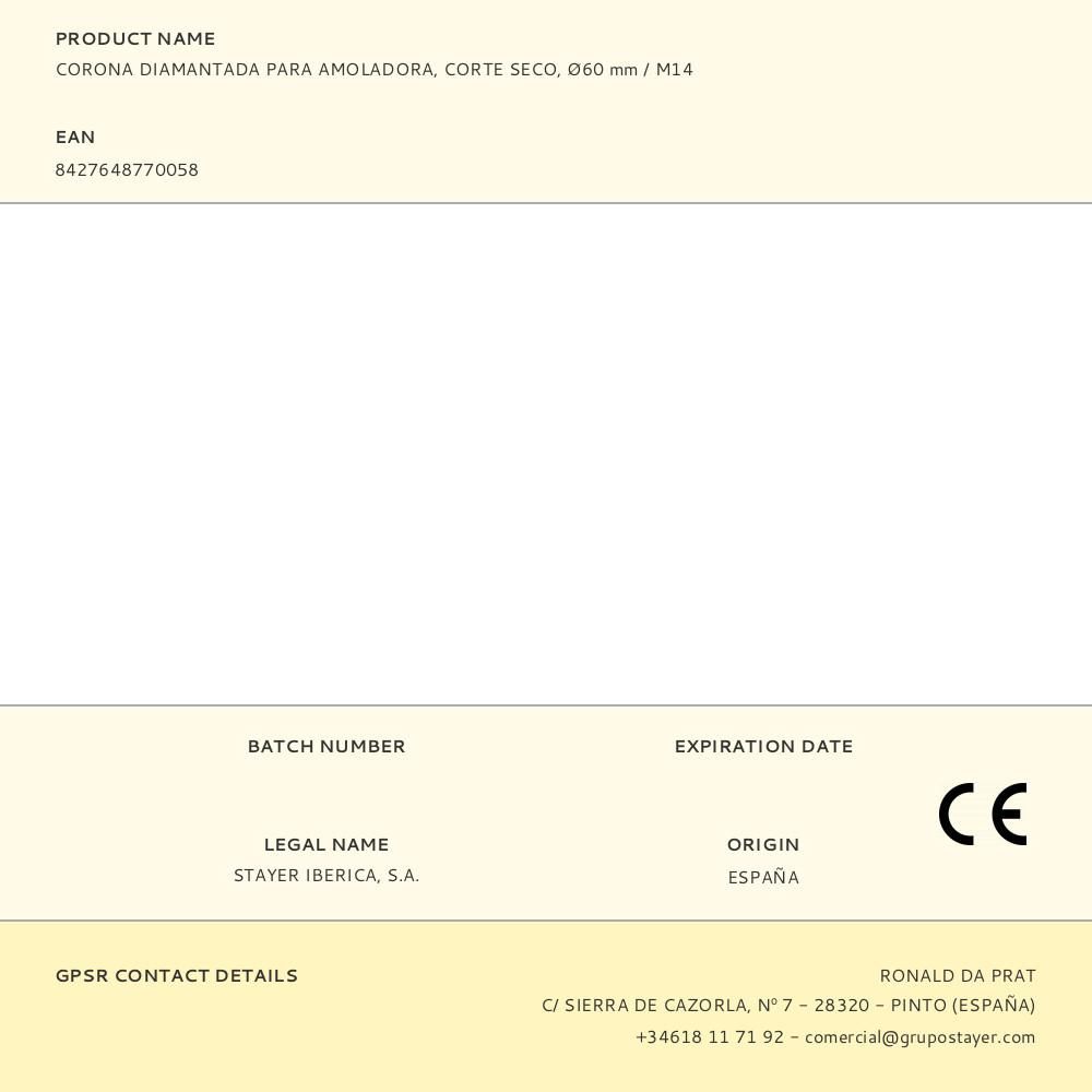 CORONA DIAMANTADA Ø60 mm, DE CORTE SECO CON INSERCIÓN M14 PARA USO CON AMOLADORAS. ESPECIALMENTE DISEÑADAS PARA PERFORACIÓN DE GRES, MATERIALES PORCELÁNICOS Y CERÁMICA, TAMBIÉN PRESENTAN UN EXCELENTE RENDIMIENTO EN LA PERFORACIÓN DE PIEDRAS NATURALES DE ALTA DUREZA COMO EL MÁRMOL O EL GRANITO