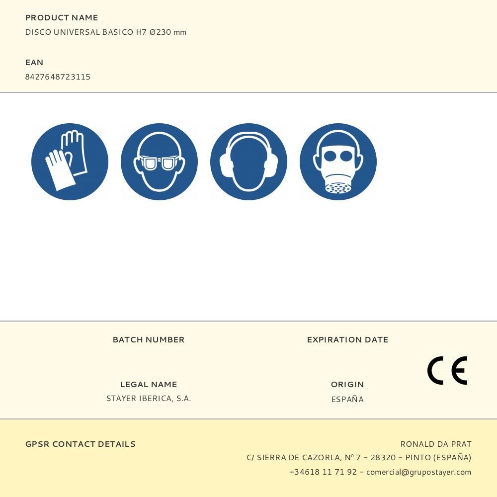 DISCO UNIVERSAL BÁSICO Ø230 mm, H7 RPM 6650. GENERAL DE CONSTRUCCIÓN, LOSETAS, BLOQUES DE HORMIGÓN, LADRILLO, TEJAS. PARA AMOLADORA ANGULAR Y TRONZADORA DE MUELA
