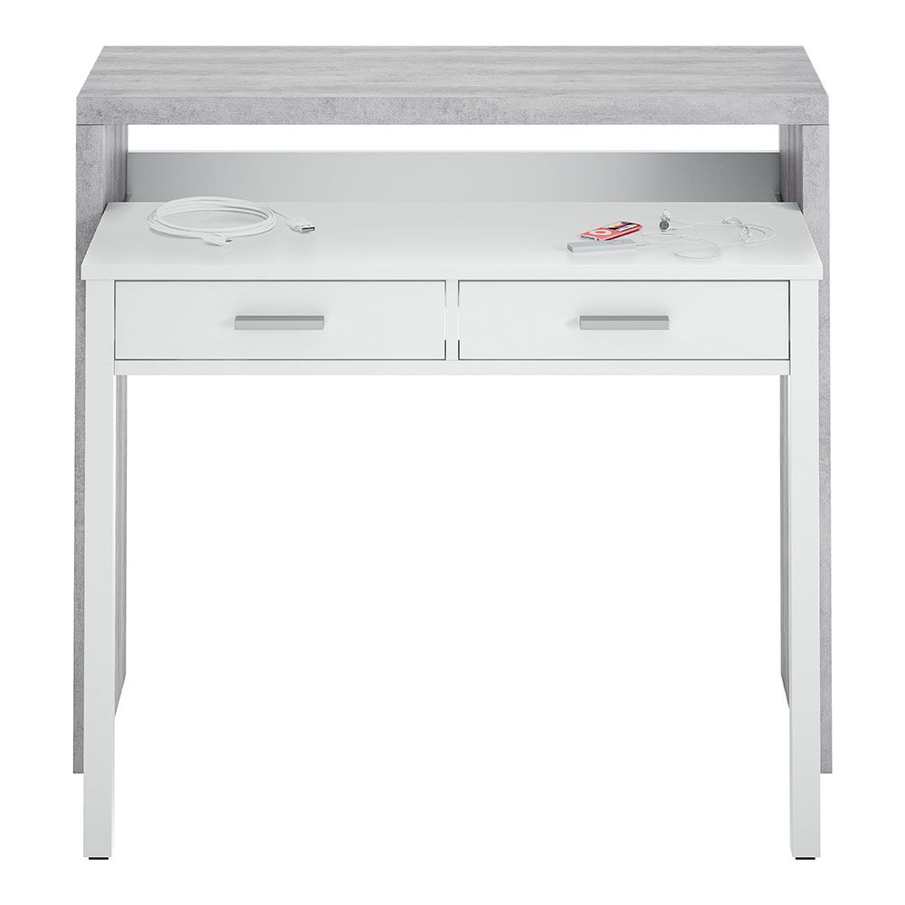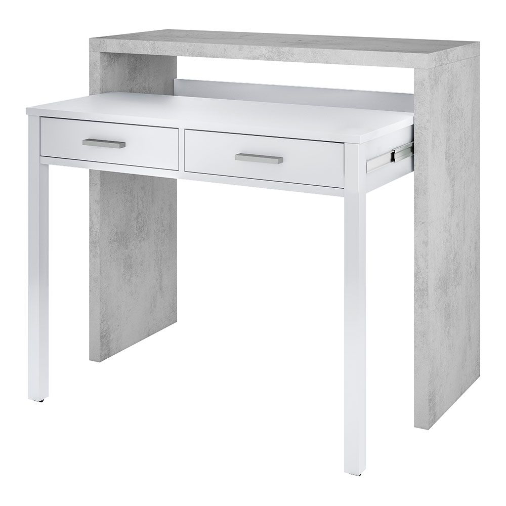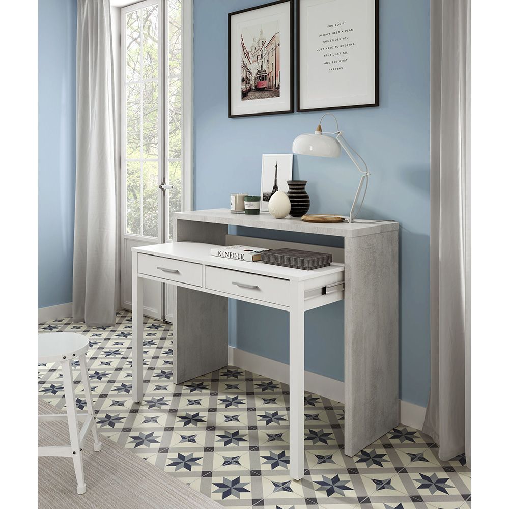CONSOLA AUXILIAR EXTENSIBLE MULTIFUNCIÓN CON 2 CAJONES DE COLOR BLANCO ARTIK Y GRIS CEMENTO, SE PUEDE USAR COMO ESCRITORIO, TOCADOR, RECIBIDOR….DE DISEÑO MODERNO Y MINIMALISTA. ESTRUCTURA RESISTENTE, GUÍAS CORREDERAS METÁLICAS PARA LA APERTURA DE LA MESA Y LOS CAJONES. RUEDAS PARA LA PARTE EXTRAÍBLE DEL MUEBLE, TACOS DE TERMOPLÁSTICO DE ALTA RESISTENCIA PARA QUITAR RUIDOS Y ANTI RAYAS.MEDIDAS DE LA MESA CERRADA: 98,5 CM (ANCHO) X 36 CM (FONDO) X 87,5 CM (ALTO). MEDIDAS DE LA MESA ABIERTA: 98,5 CM (ANCHO) X 66 CM (FONDO) X 87,5 CM (ALTO). CAPACIDAD DE LOS CAJONES: 38 CM (ANCHO) X 30 CM (FONDO) X 8 CM (ALTO). SERVICIO DE POSTVENTA GRATUITO: postventa@fores-group.com