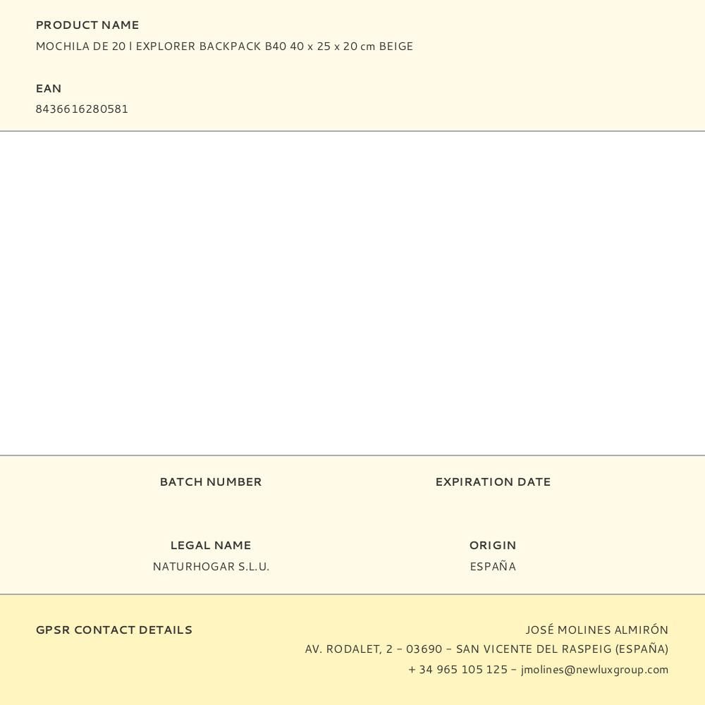 MOCHILA DE 20 l EXPLORER BACKPACK B40 40 x 25 x 20 cm BEIGE