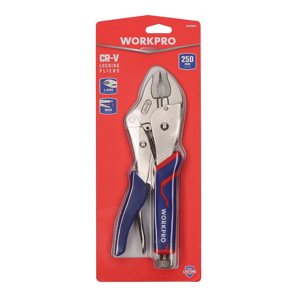 MORDAZAS DE PRESIÓN 250 mm / 10 pulg. ACERO CROMO MOLIBDENO PARA MÁXIMA DURABILIDAD. ACCIÓN DE BLOQUEO Y LIBERACIÓN RÁPIDA Y SENCILLA. LA LIBERACIÓN PROTEGIDA AYUDA A MANTENER EL TRABAJO RÁPIDO Y SEGURO. GIRE EL TORNILLO PARA AJUSTAR LA PRESIÓN DE SUJECIÓN. MANGO DE AGARRE CÓMODO DE TRES MATERIALES