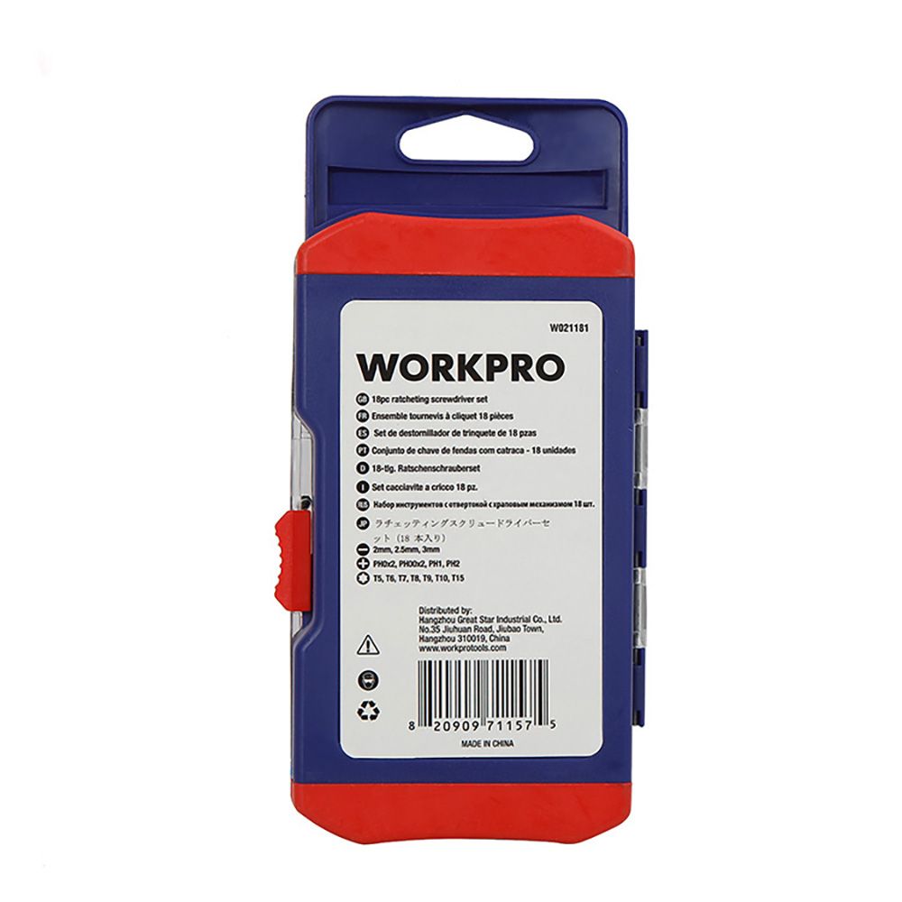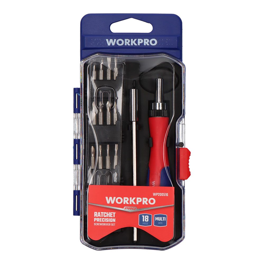 DESTORNILLADOR DE PRECISIÓN 18 PIEZAS. CONTIENE: 16 PUNTAS DE CROMO VANADIO, 1 MANGO CARRACA PRECISIÓN, 1 BARRA EXTENSIÓN. PUNTAS: PH00X2,PH0X2,PH1,PH2 - PLANAS: 2.5 mm,3 mm,2 mm - T5,T6,T7,T8,T9,T10,T15. AZUL Y ROJO