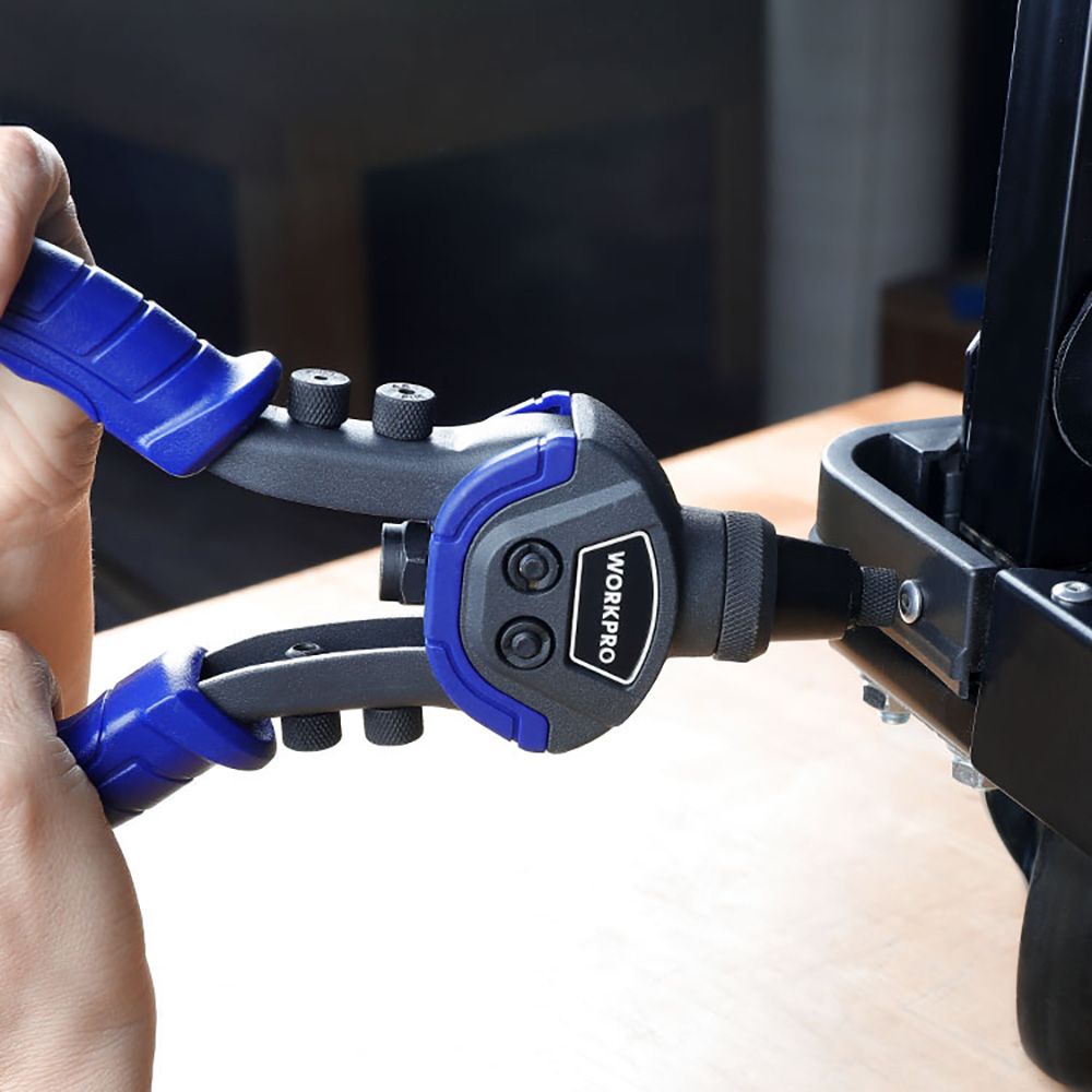 REMACHADORA MANUAL 250 mm - 10 pulg, BOQUILLAS: 2.4 x 6 mm, 3.2 x 6 mm, 4.0 x 6 mm, 4.8 x 6 mm, 6.4 x 13 mm. MANGO ERGONÓMICO ANTIDESLIZANTE AZUL Y NEGRA