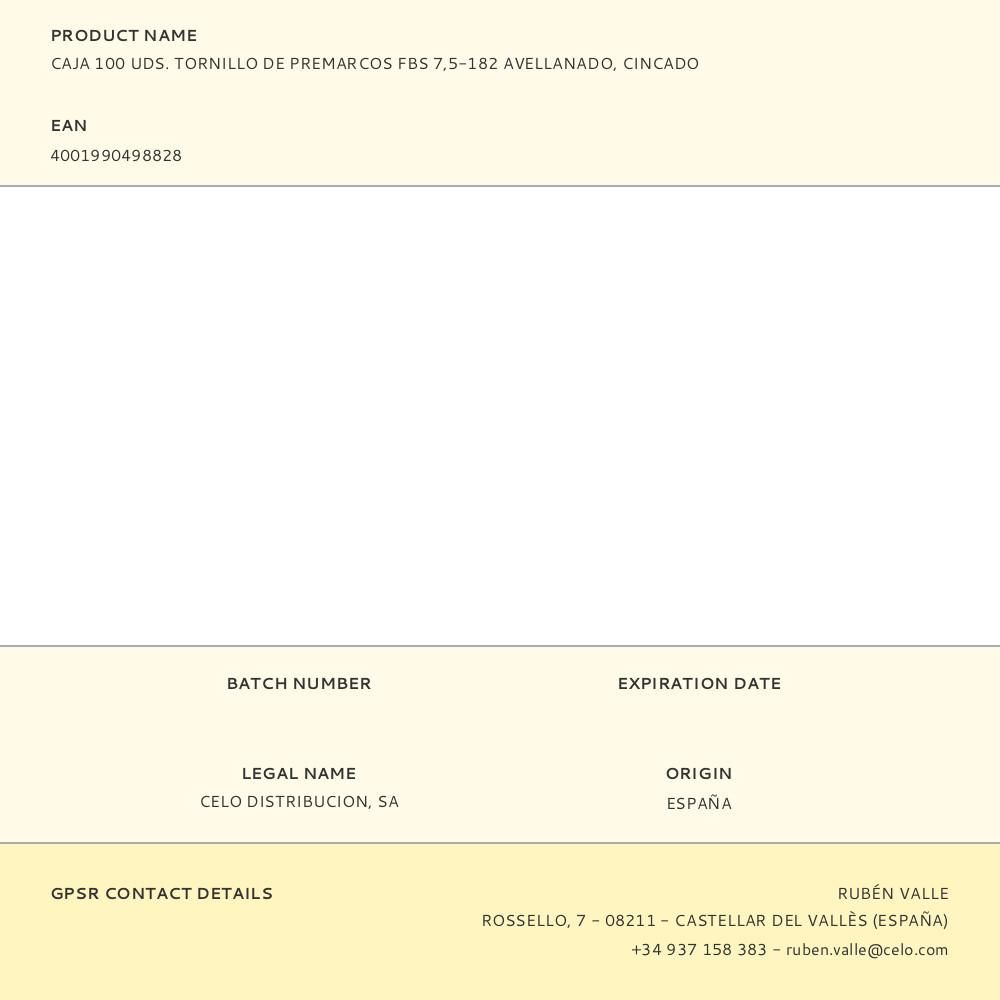 CAJA 100 UDS. TORNILLO DE PREMARCOS FBS 7,5-182 AVELLANADO, CINCADO