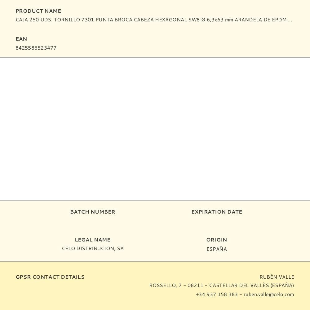 CAJA 250 UNID. TORNILLO 7301 PUNTA BROCA CABEZA HEXAGONAL SW8 Ø 6,3x63 mm ARANDELA DE EPDM Ø16 CINCADO